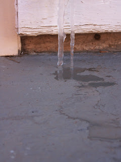 My very own twin icicles, hanging from the threshold of my front door. It was 13 degrees here today, and the high was only 34. Usually the low is 34. Temps in the teens are very cold for here.